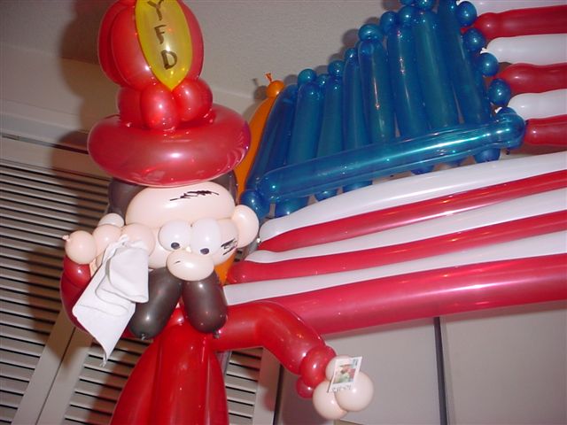 Sausage shaped balloons professionally twisted to bear semblance of a US flag and a New York Fire Department firefighter. The firefighter is in a posture of wiping his tears with handkerchief. Here's another photo showing the firefighter's face.