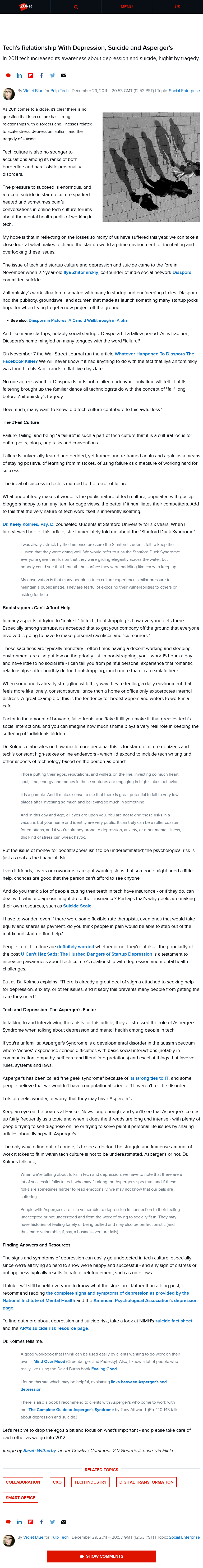 - http://www.zdnet.com/blog/violetblue/techs-relationship-with-depression-suicide-and-aspergers/904